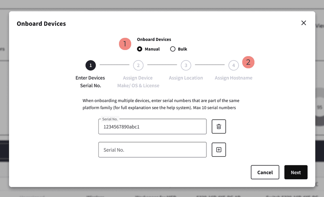 Due to API limitations, device type and OS could not be identified for some serial numbers. To prevent onboarding failures, device type selection was moved earlier in the flow, restricting mixed device types in a single onboarding action.