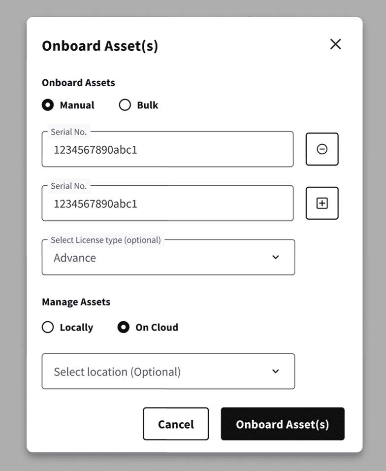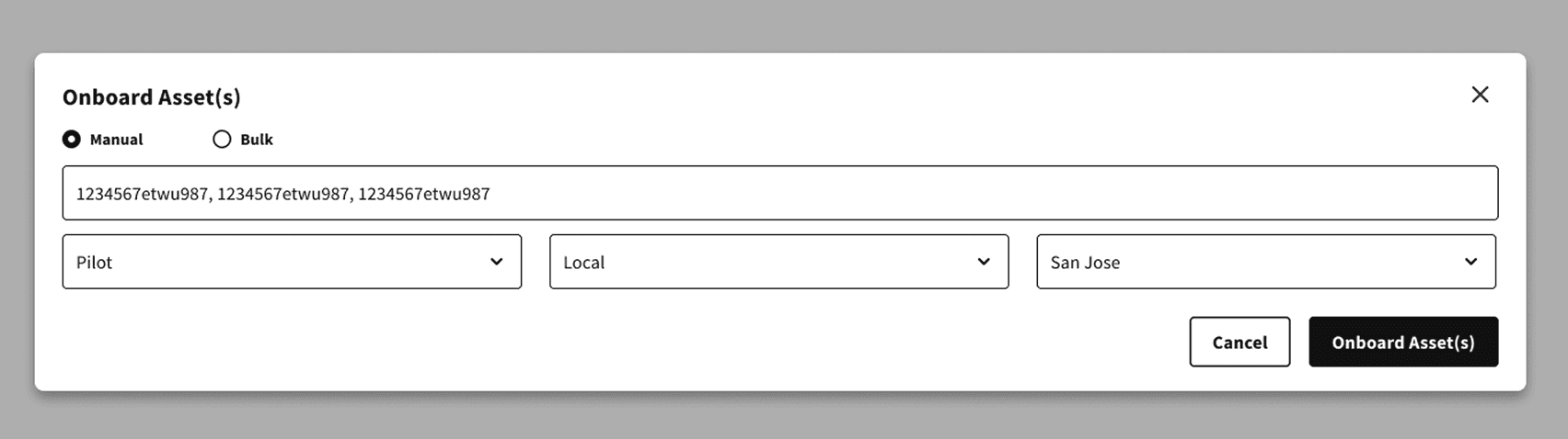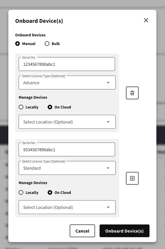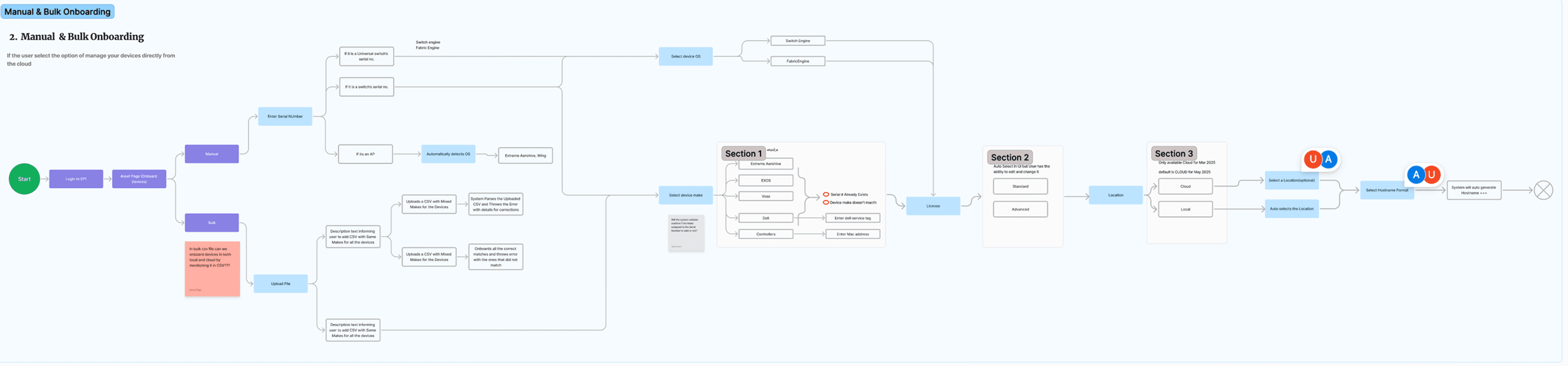 Placing Manual and Bulk as top-level options increased the risk of accidental context switching. If a user changed the mode mid-flow, all entered data was lost. To prevent data loss and reduce error risk during device onboarding, I removed this later.